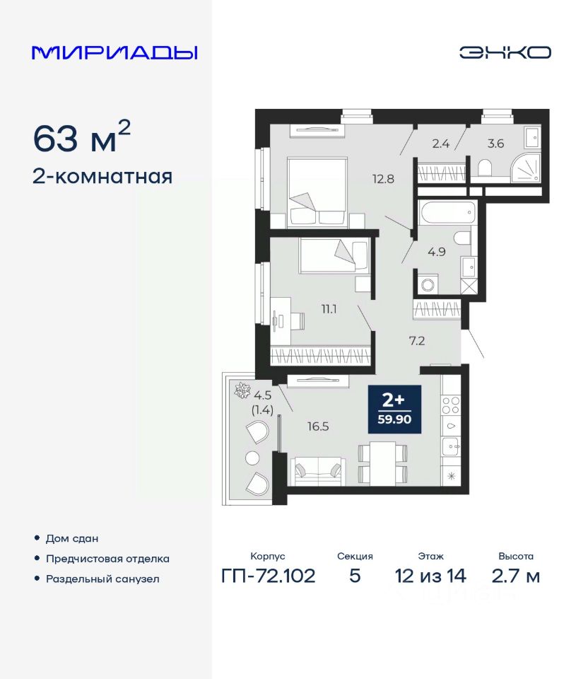 Продается двухкомнатная квартира с предчистовой отделкой в ЖК ''Мириады'' на 12 этаже. Общая площадь: 63 кв.м. Высота потолков 2.7 м.