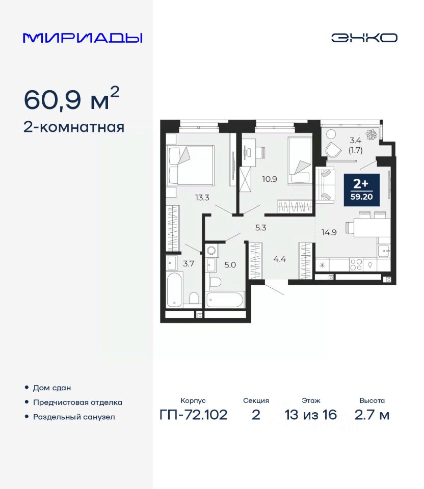 Продается двухкомнатная квартира от застройщика с предчистовой отделкой в ЖК ''Мириады'' на 13 этаже. Общая площадь: 60.9 кв.м. Высота потолков 2.7 м.