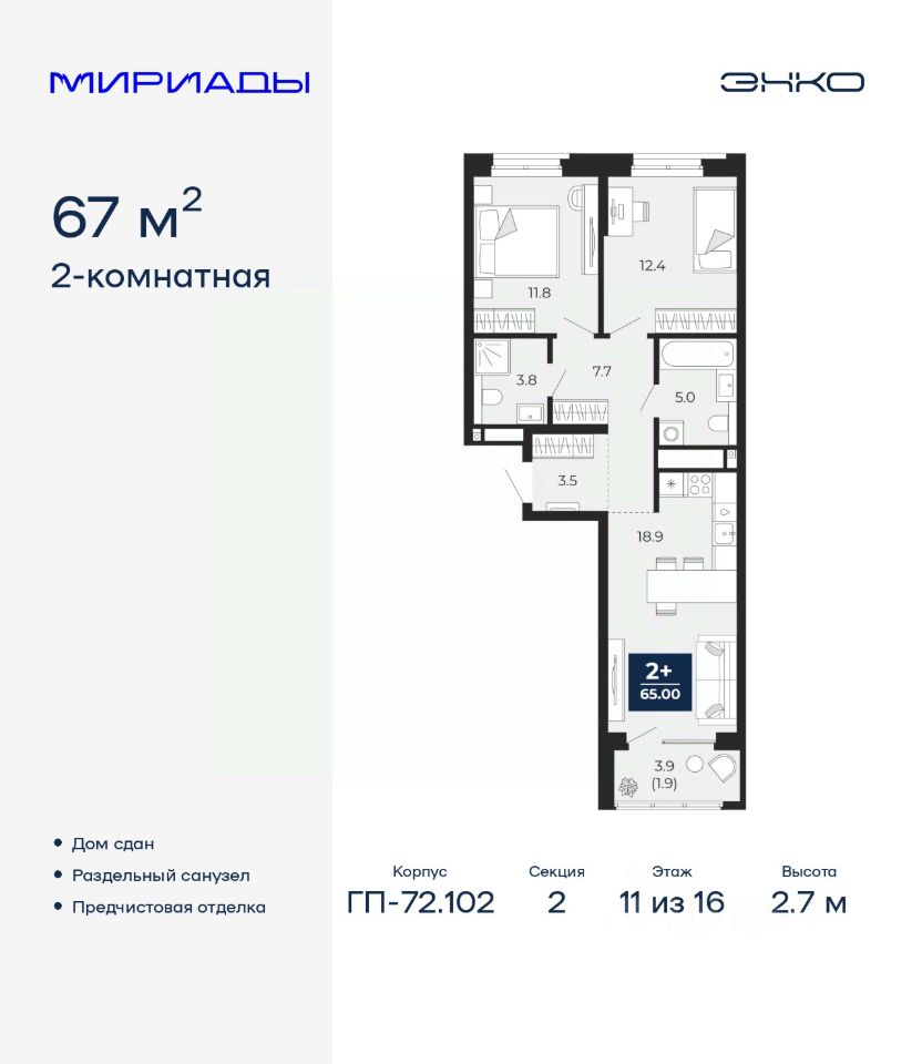 2-комн. квартира от застройщика с предчистовой отделкой в ЖК ''Мириады'' на 11 этаже. Общая площадь: 67 кв.м. Высота потолков 2.7 м.
