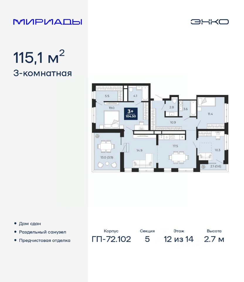 Продается 3-комн. квартира с предчистовой отделкой в ЖК ''Мириады'' на 12 этаже. Общая площадь: 115.1 кв.м. Высота потолков 2.7 м.