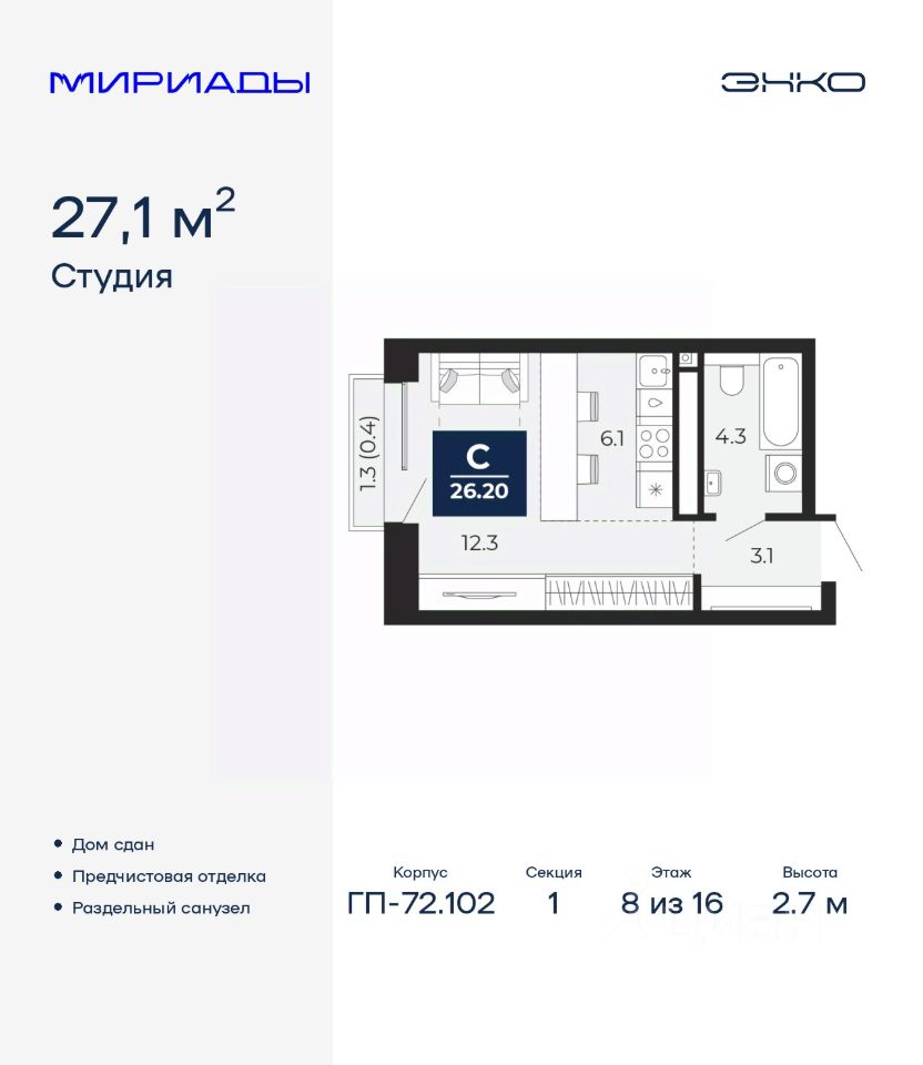 1-комн. квартира-студия с предчистовой отделкой в ЖК ''Мириады'' на 8 этаже. Общая площадь: 27.1 кв.м. Высота потолков 2.7 м.