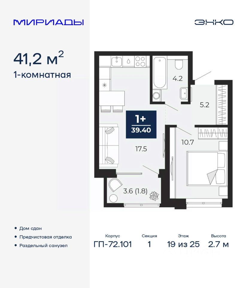 Продается 1-комн. квартира от застройщика с предчистовой отделкой в ЖК ''Мириады'' на 19 этаже. Общая площадь: 41.2 кв.м. Высота потолков 2.7 м.