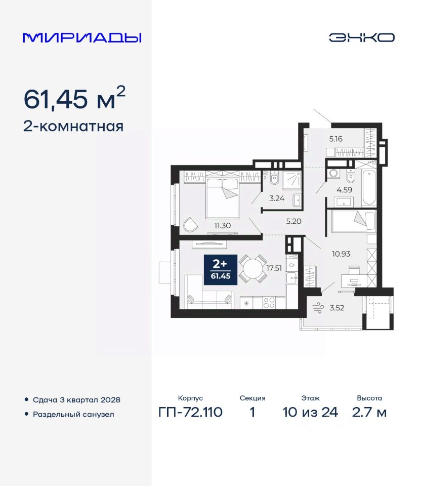2-комн. квартира от застройщика в ЖК ''Мириады'' на 10 этаже. Общая площадь: 61.45 кв.м. Высота потолков 2.7 м.