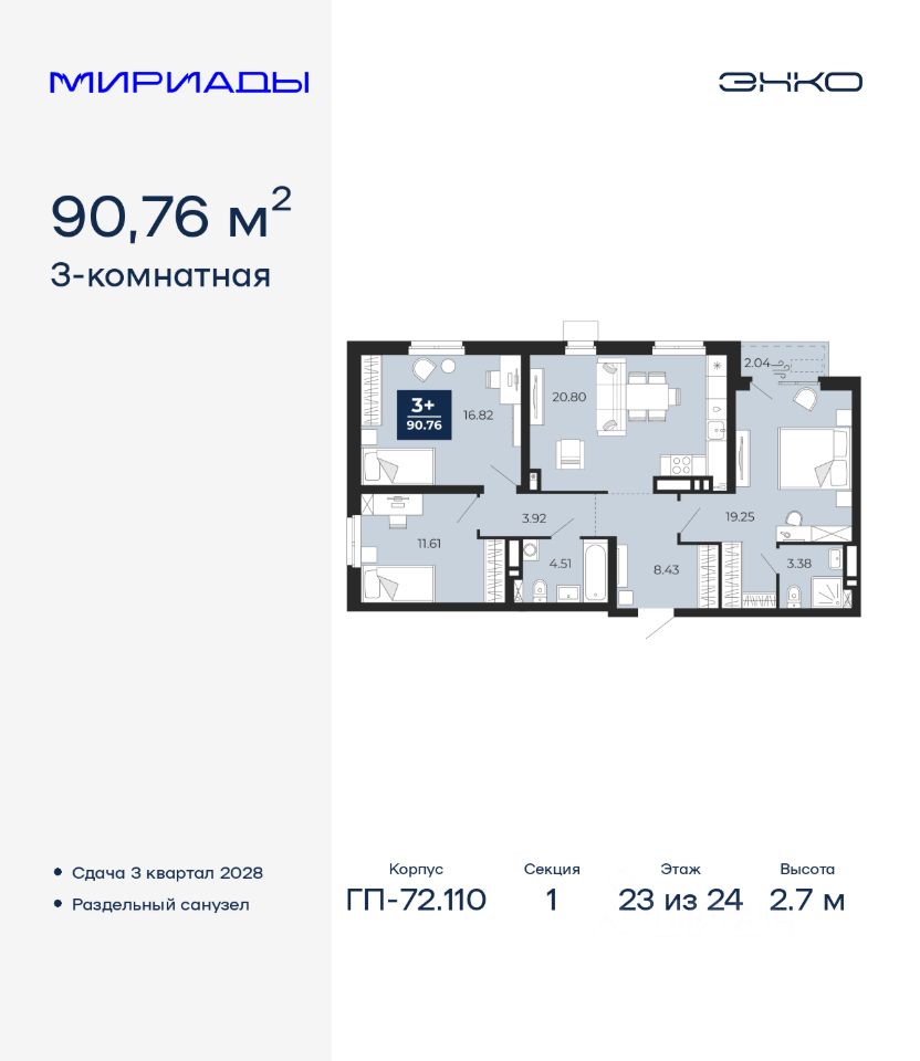 Продается 3-комн. квартира от застройщика в ЖК ''Мириады'' на 23 этаже. Общая площадь: 90.76 кв.м. Высота потолков 2.7 м.