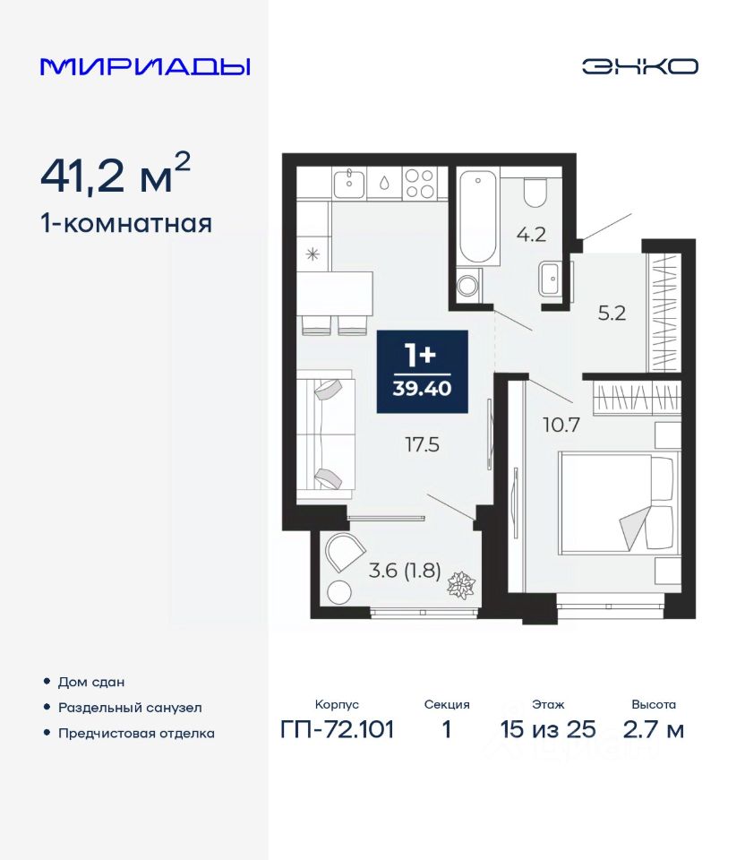 Однокомнатная квартира с предчистовой отделкой в ЖК ''Мириады'' на 15 этаже. Общая площадь: 41.2 кв.м. Высота потолков 2.7 м.