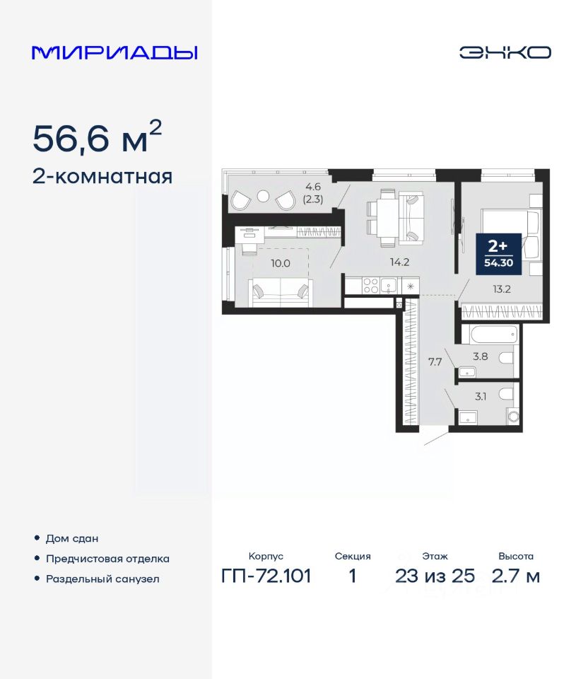 2-комн. квартира с предчистовой отделкой в ЖК ''Мириады'' на 23 этаже. Общая площадь: 56.6 кв.м. Высота потолков 2.7 м.
