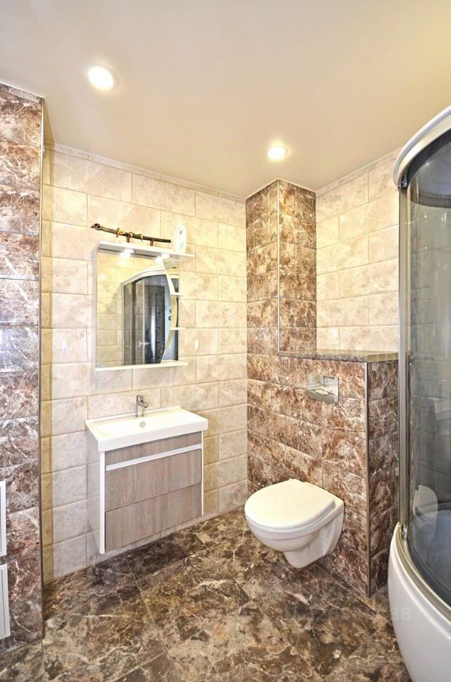 В санузле выложена красивая дизайнерская плитка, сделана инсталляция. А душевую кабину всегда можно заменить, или поставить ванну, не нарушив конструкции керамической плитки. Квартира готова к проживанию! Сверху соседей нет, в этом плюс верхнего этажа! Никто не мешает.