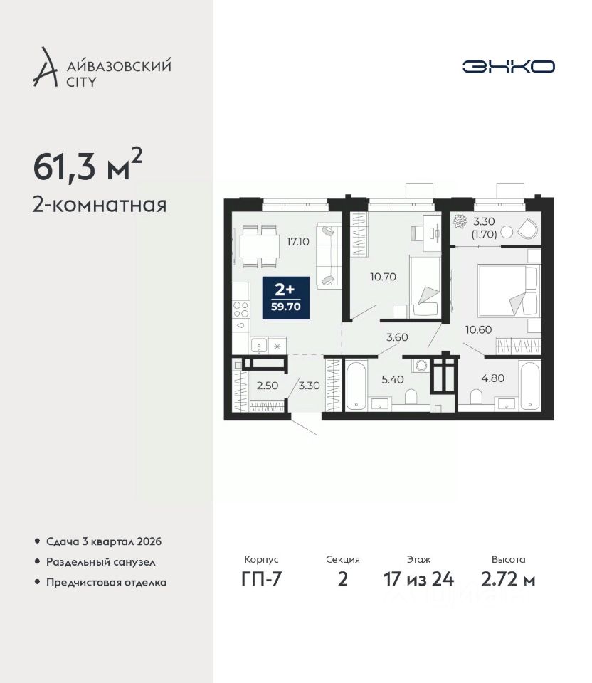 Продается 2-комн. квартира с предчистовой отделкой в ЖК ''Айвазовский City'' на 17 этаже. Общая площадь: 61.3 кв.м. Высота потолков 2.72 м.