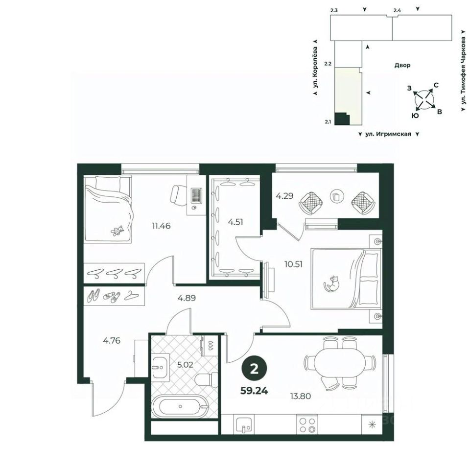 Классическая двухкомнатная квартира с мастер-спальней, оборудованной гардеробной и выходом на лоджию. Санузел совмещенный, что позволяет сэкономить средства на ремонте. Окна выходят на две стороны.