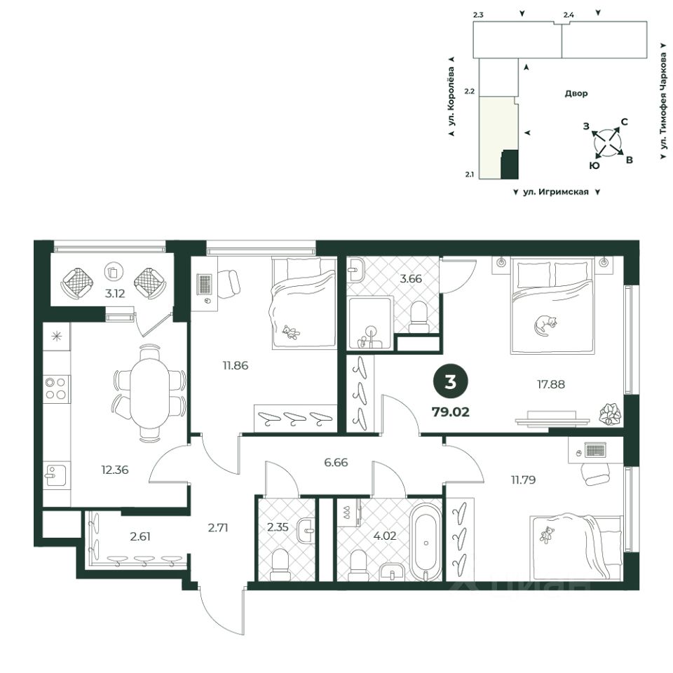 Трехкомнатная квартира с мастер-спальней, оборудованной саузлом. Из кухни можно выйти на лоджию. В прихожей предусмотрено место под гардеробную. Для стирки и глажки есть постирочная, из которой, при желании, можно сделать гостевой санузел. Окна выходят на две стороны.