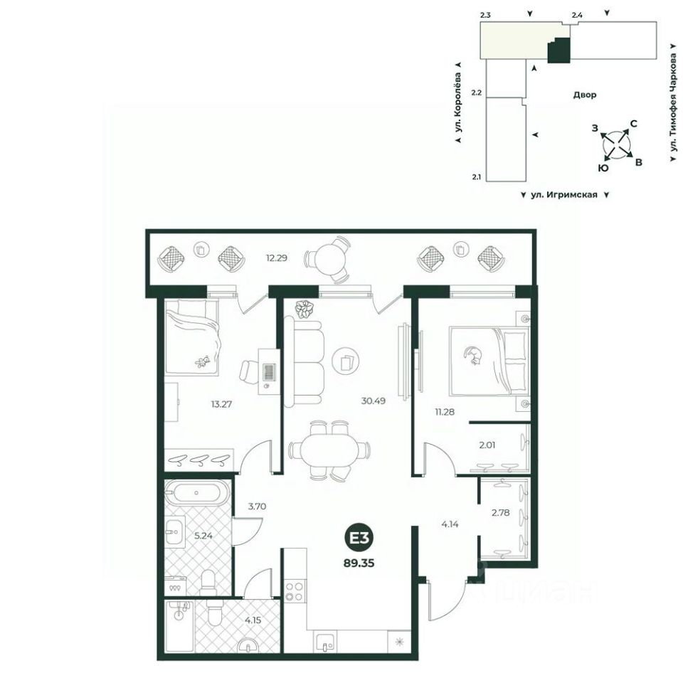 Евротрехкомнатная квартира с мастер-спальней, в которой есть собственная гардеробная. В просторной кухне-гостиной комфортно собираться всей семьей. Наличие гостевого санузла обеспечивает комфорт приглашенным. Благодаря собственной террасе можно больше времени проводить на свежем воздухе, заниматься спортом, присматривать за детьми, играющими во дворе.