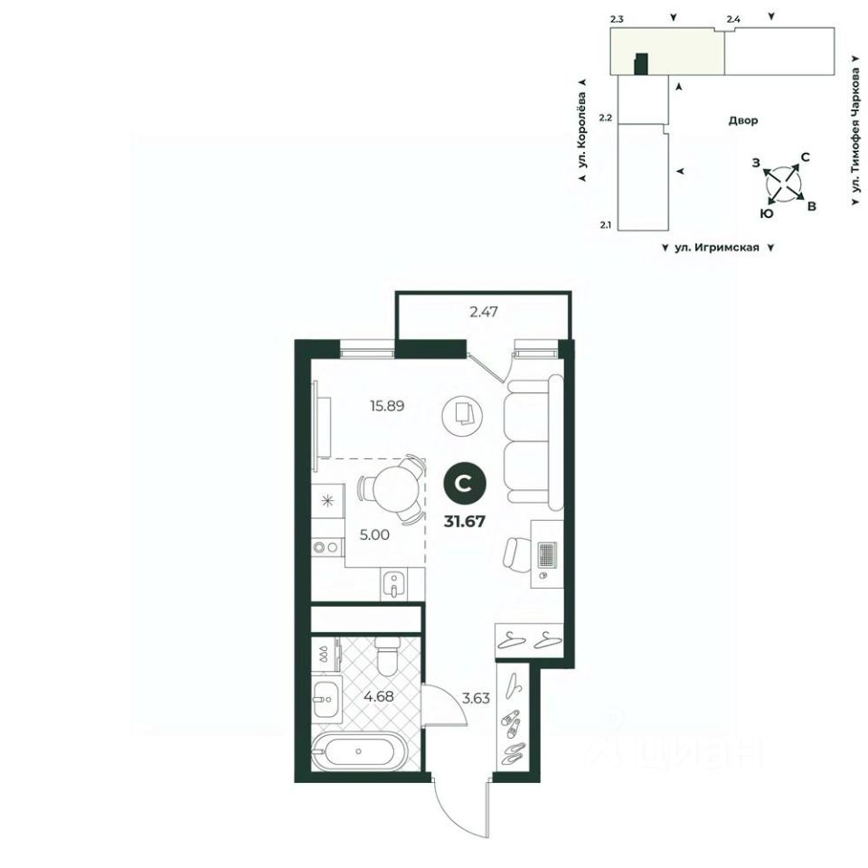 Просторная студия с французским балконом и видом во двор. Благодаря отсутствию стен пространство квартиры визуально расширяетя, что делает ее более уютной.