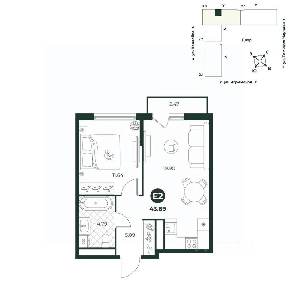 Евродвухкомнатная квартира с просторной кухней-гостиной и выходом на французский балкон. Площадь ванной комнаты позволяет установить стиральную машину. В прихожей предусмотрена ниша под шкаф.
