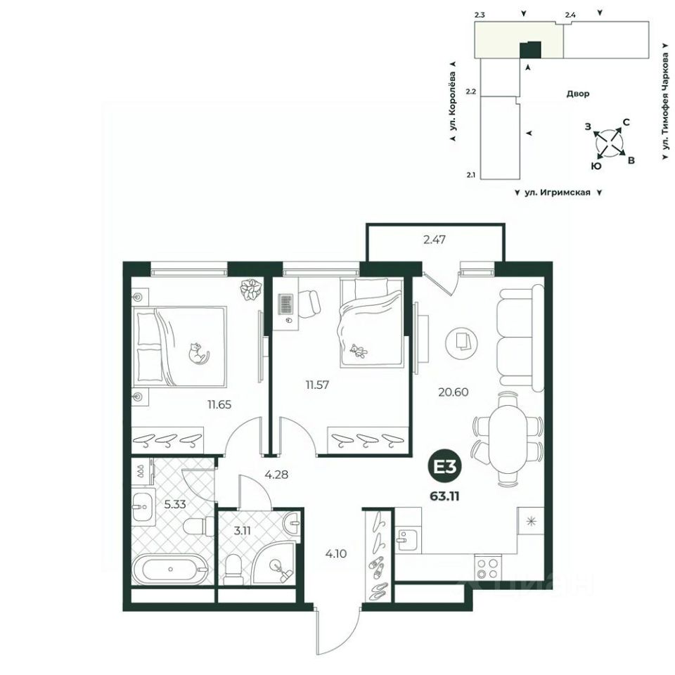 Евротрехкомнатная квартира с просторной кухней-гостиной, которая идеально подходит для большой семьи, позволяя комфортно разместить всех домочадцев. В одной из комнат есть выход на балкон с видом во двор. Планировкой предусмотрено два санузла. В прихожей есть ниша под шкаф с верхней одеждой.