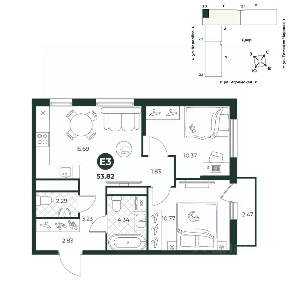 Трехкомнатная квартира евроформата с просторной кухней-гостиной отлично подойдет для теплых вечеров в компании близких. Наличие гостевого санузла имеет преимущества как для хозяев, так и для гостей. В одной из комнат есть выход на балкон. Окна расположены на две стороны.