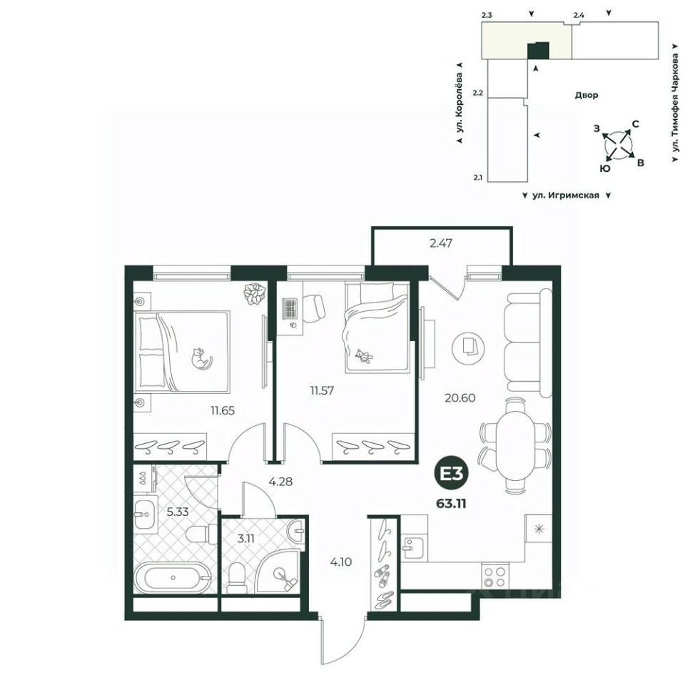 Евротрехкомнатная квартира с просторной кухней-гостиной, которая идеально подходит для большой семьи, позволяя комфортно разместить всех домочадцев. В одной из комнат есть выход на балкон с видом во двор. Планировкой предусмотрено два санузла. В прихожей есть ниша под шкаф с верхней одеждой.