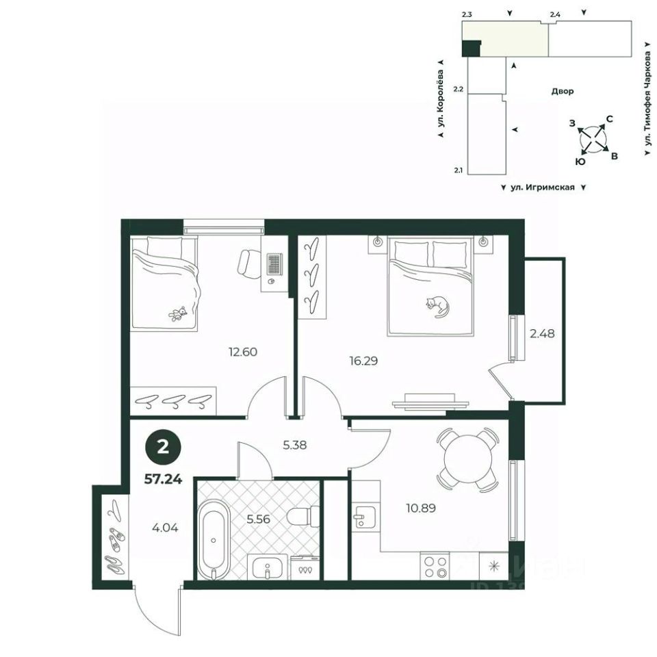 Классическая двухкомнатная квартира с выходом на французский балкон. Санузел совмещенный, что позволяет рационально использовать ограниченные квадратные метры. В прихожей можно установить шкаф для одежды.