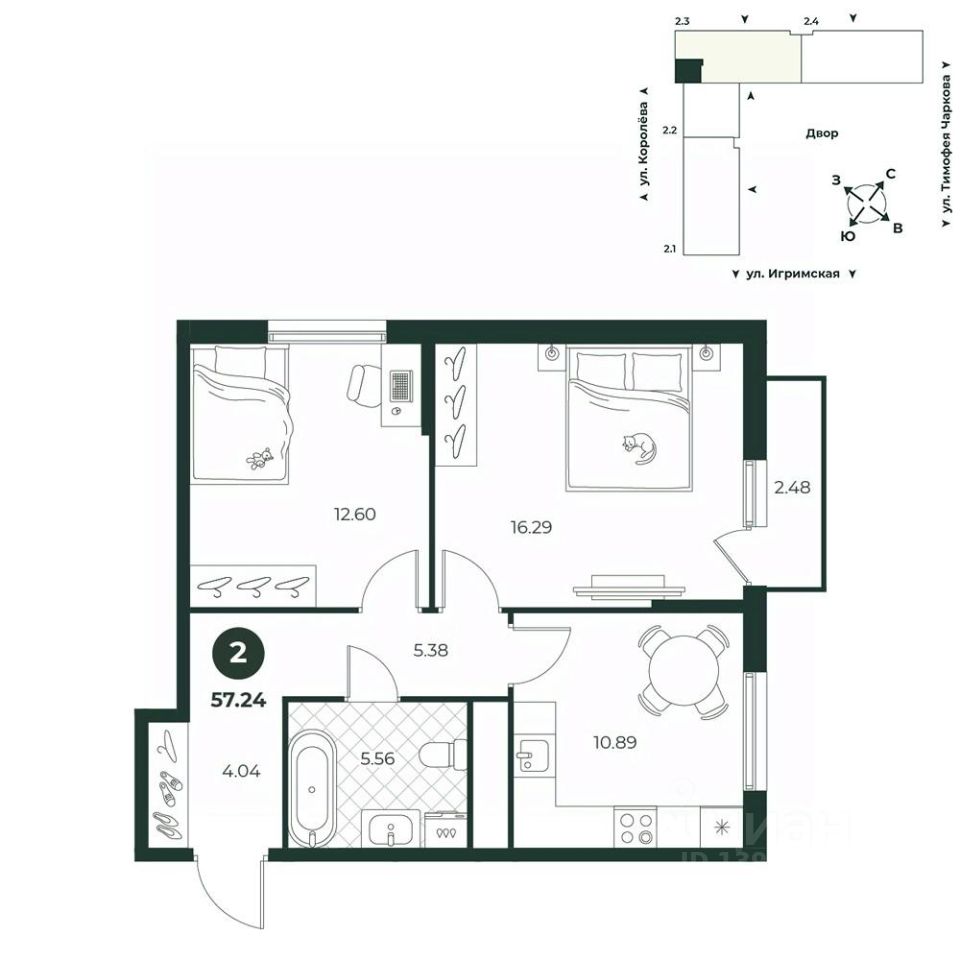 Классическая двухкомнатная квартира с выходом на французский балкон. Санузел совмещенный, что позволяет рационально использовать ограниченные квадратные метры. В прихожей можно установить шкаф для одежды.