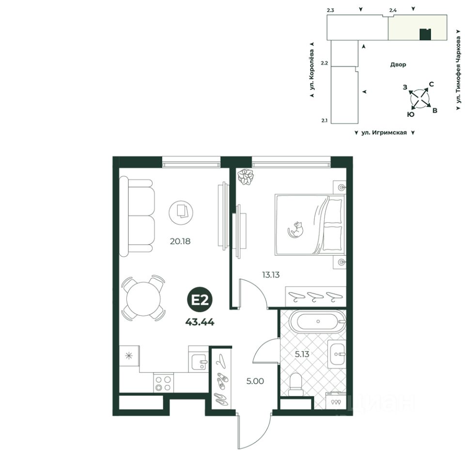 Двухкомнатная квартира евроформата с просторной кухней-гостиной обеспечивает комфортное времяпрепровождение всей семьи. В прихожей есть ниша под шкаф. Окна квартиры выходят во двор.