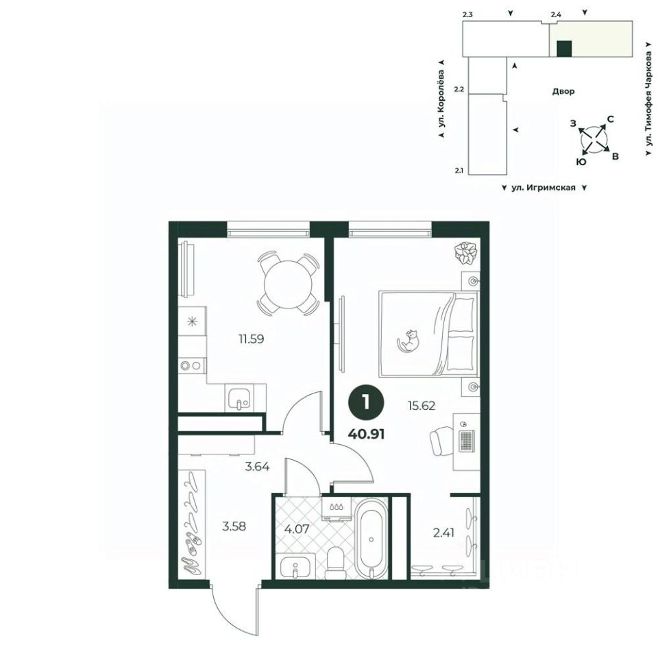 Классическая однокомнатная квартира с мастер-спальней, содержащей гардеробную. Просторная ванная комната позволит установить стиральную и сушильную машины.