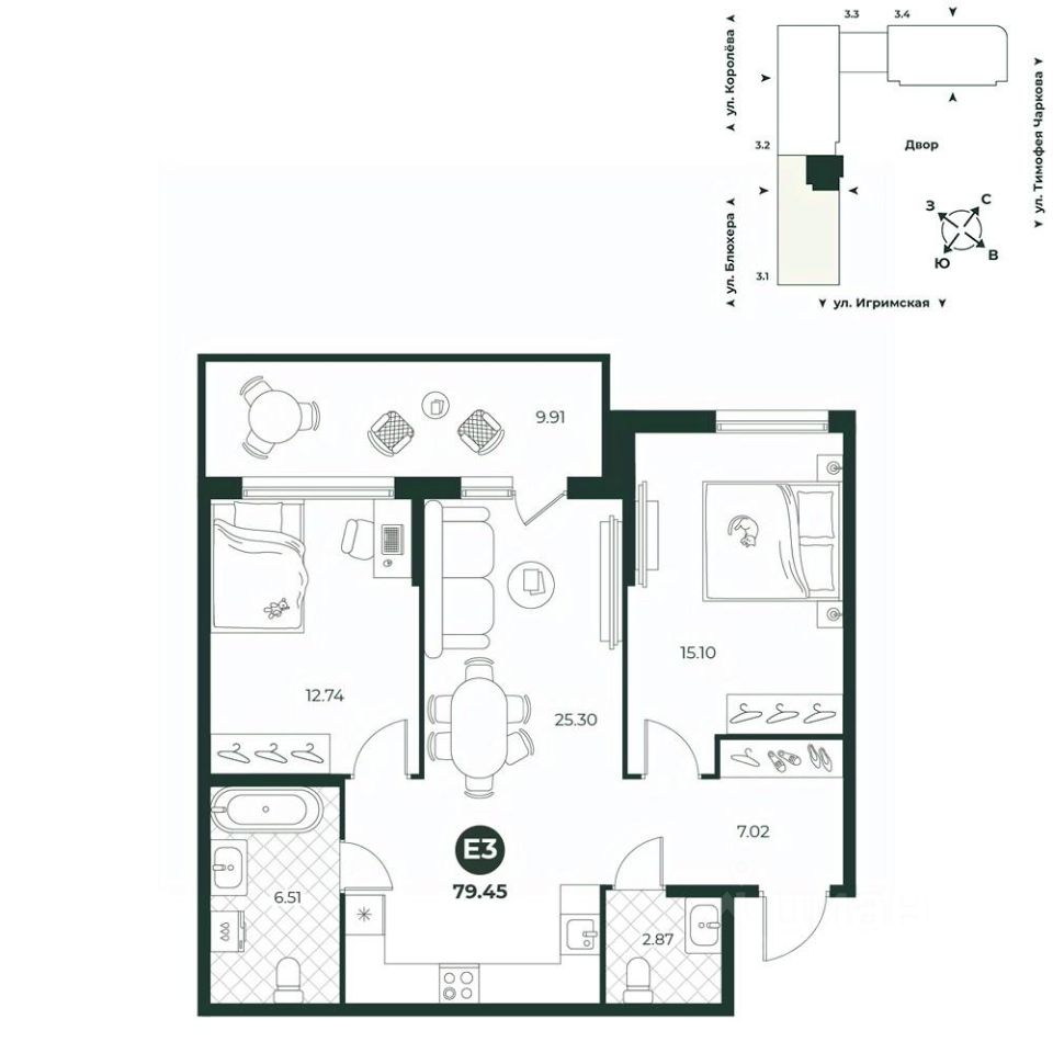 Евротрехкомнатная квартира с просторной кухней-гостиной. Есть терраса: в летнее время на ней можно организовать зону отдыха, а в зимнее - установить елку. Планировкой предусмотрено два санузла - гостевой и полноценная ванная комната.