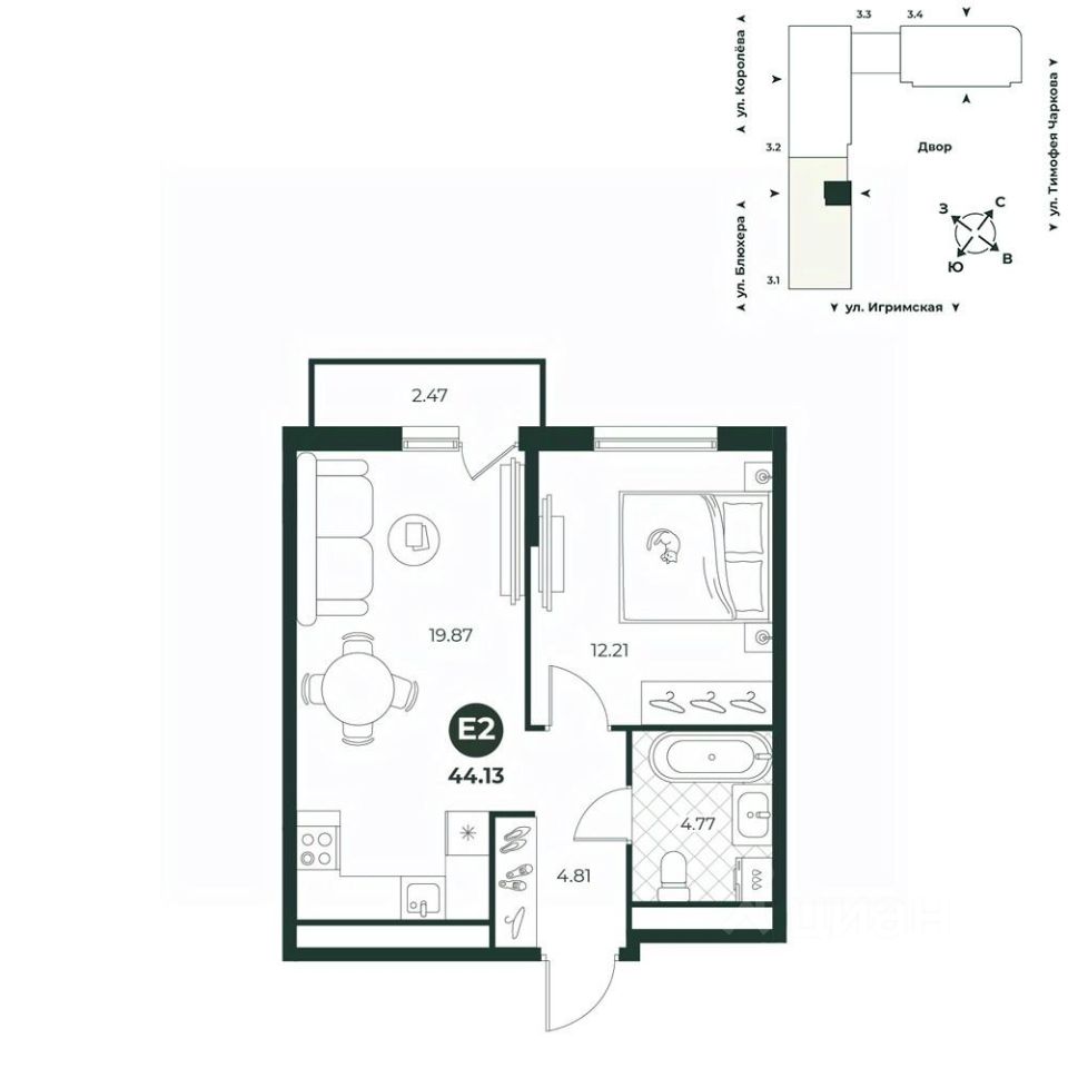 Евродвухкомнатная квартира с французским балконом и просторной кухней-гостиной. Подойдет тем, кто любит проводить время в кругу семьи и друзей. Санузел совмещенный, позволяет разместить стиральную и сушильные машины. В прихожей есть ниша под шкаф.
