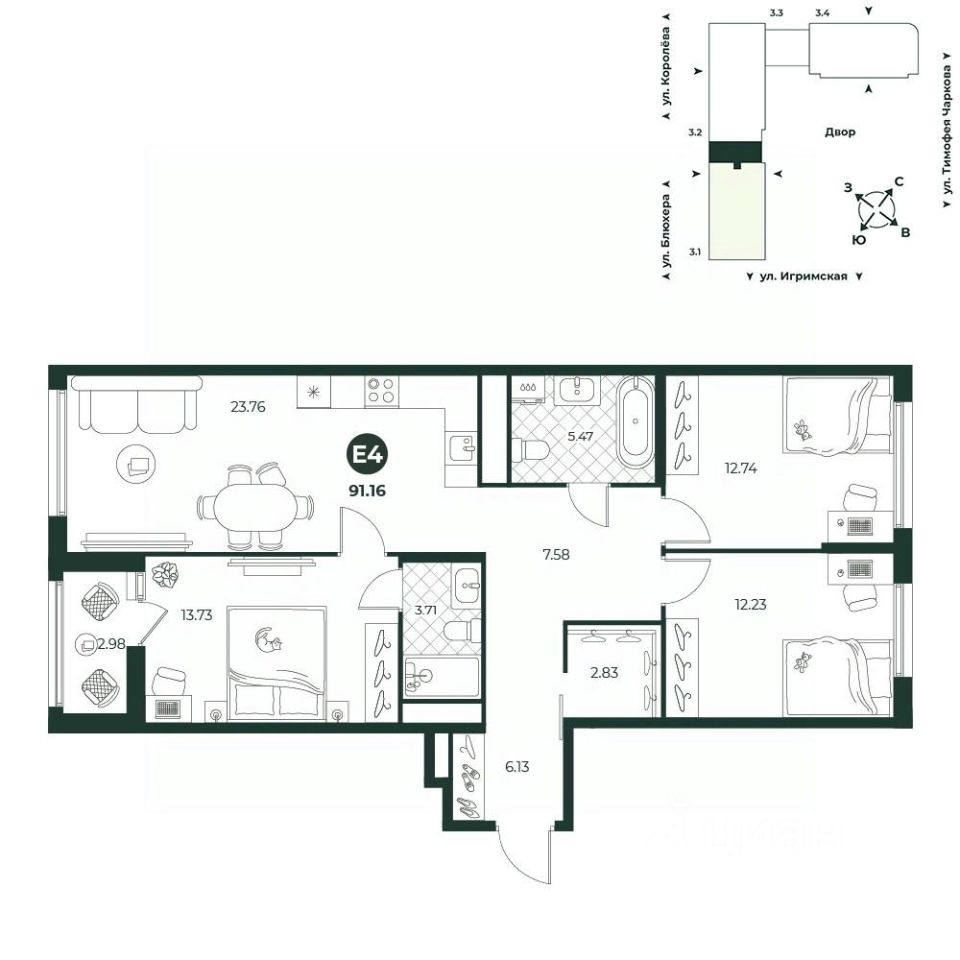 Еврочетырехкомнатная квартира с мастер-спальней, обустроенной санузлом и выходом на собственную лоджию. Просторная кухня-гостиная повышает социальную активность-можно общаться с семьей и гостями во время готовки. В прихожей есть комната, в которой можно организовать гардеробную. Окна выходят на две стороны.