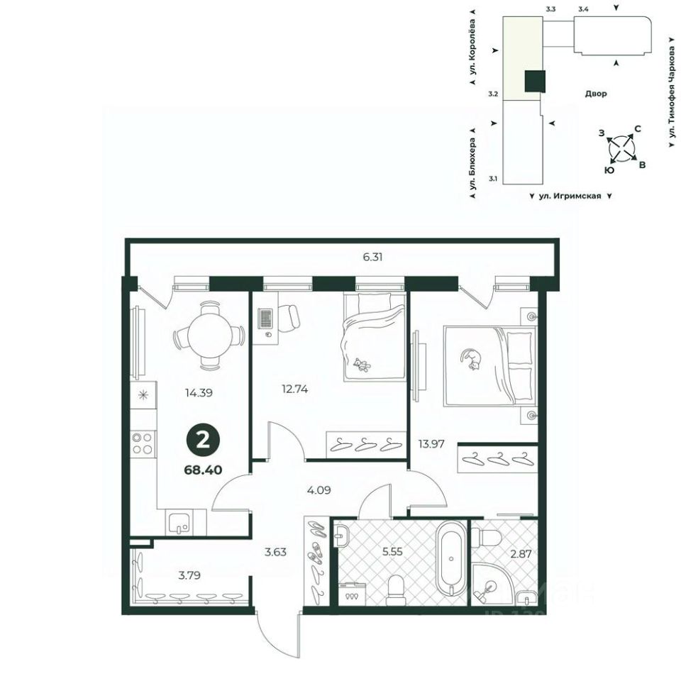 Двухкомнатная квартира с мастер-спальней, оборудованной гардеробной и санузлом. Терраса, на которую можно выйти из кухни и комнаты, отлично подходит для размещения зоны отдыха. В прихожей можно огранизовать полноценную зону для хранения. Ванная комната вмещает стиральную машину.