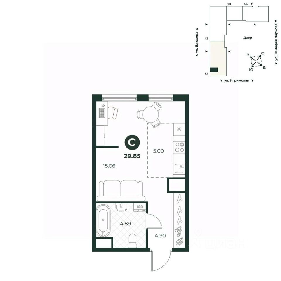 Просторная студия с видом на променад. В комнате выделена зона под кухонный гарнитур, достаточно пространства для отдыха и организации рабочего места.