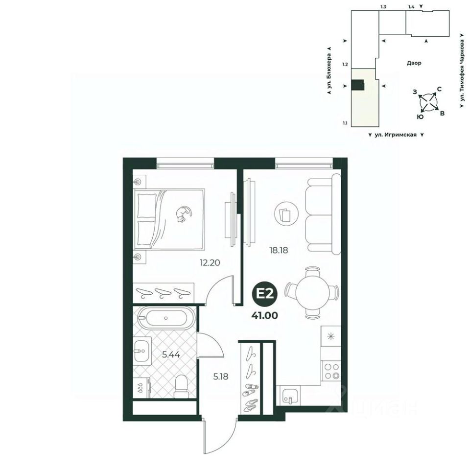 Однокомнатная квартира евроформата с просторной кухней-гостиной для дружеских встреч. Ванная комната позволяет установить стиральную и сушильную машины.