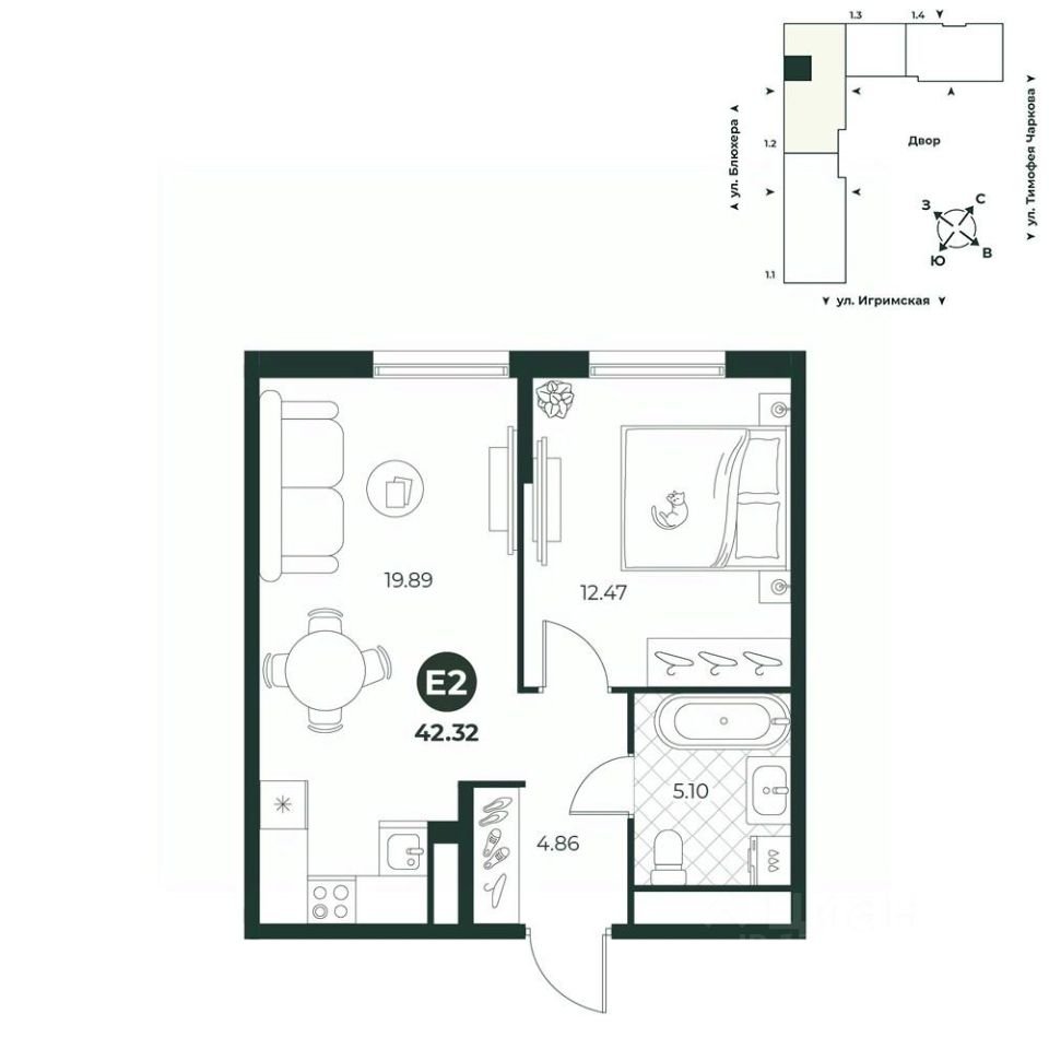 Евродвухкомнатная квартира с большой ванной комнатой, в которой можно установить стиральную и сушильную машины. В прихожей есть ниша под шкаф.