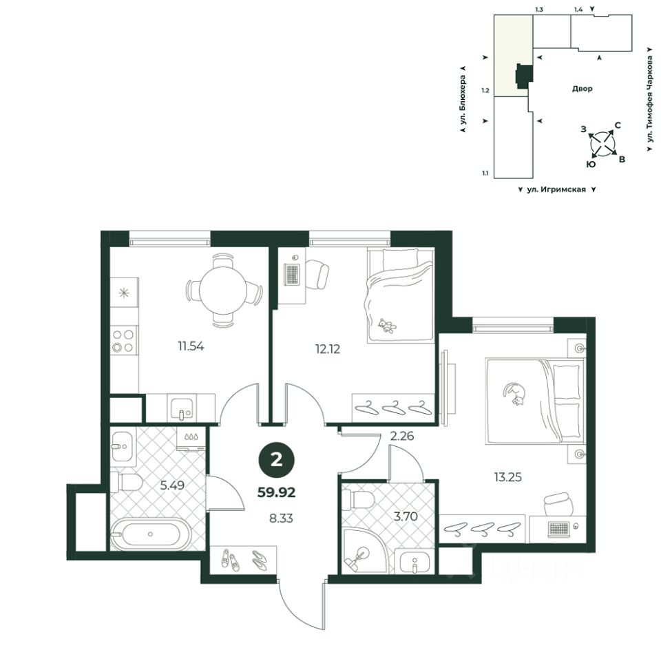 Двухкомнатная квартира с мастер-спальней и двумя санузлами. Площадь одного позволяет установить стиральную и сушильную машины. Комнаты правильной формы.