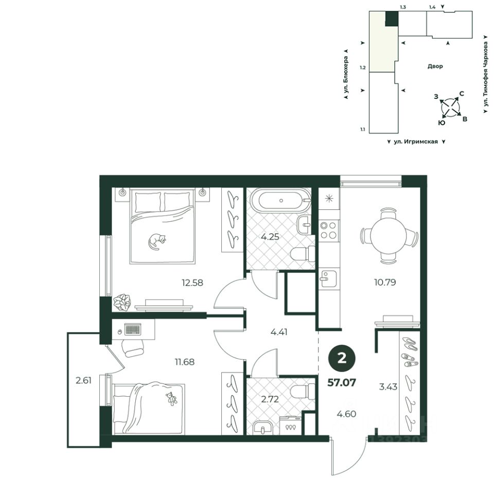 Классическая двухкомнатная квартира с двумя санузлами. Из спальни можно выйти на французский балкон. В прихожей предусмотрено место под гардеробную. Окна на две стороны.