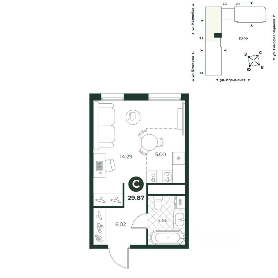 Просторная студия, в которой гармонично сочетаются функциональность и уют. В комнате выделена зона под кухонный гарнитур, а в прихожей есть ниша под шкаф.