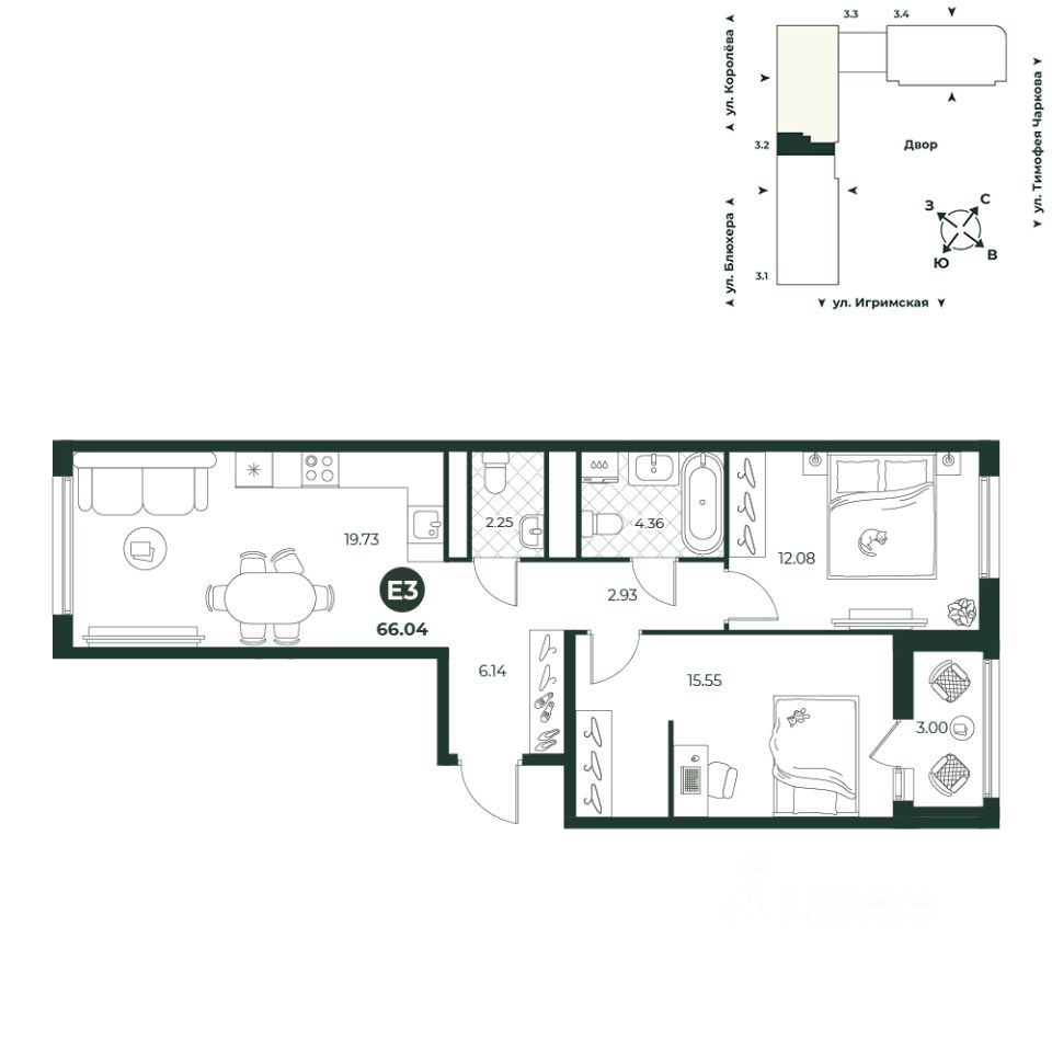 Евротрехкомнатная квартира с мастер-спальней, оборудованной гардеробной и собственным выходом на лоджию. Просторная кухня-гостиная позволяет комфортно готовить и одновременно следить за детьми, принимать гостей. Планировкой предусмотрено два санузла. Окна квартиры выходят на две стороны.