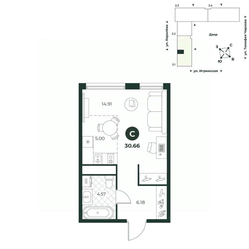 Просторная студия с видом на променад. В комнате выделена зона под кухонный гарнитур, площадь позволяет разделить пространство на функциональные зоны - отдыха и приема пищи.