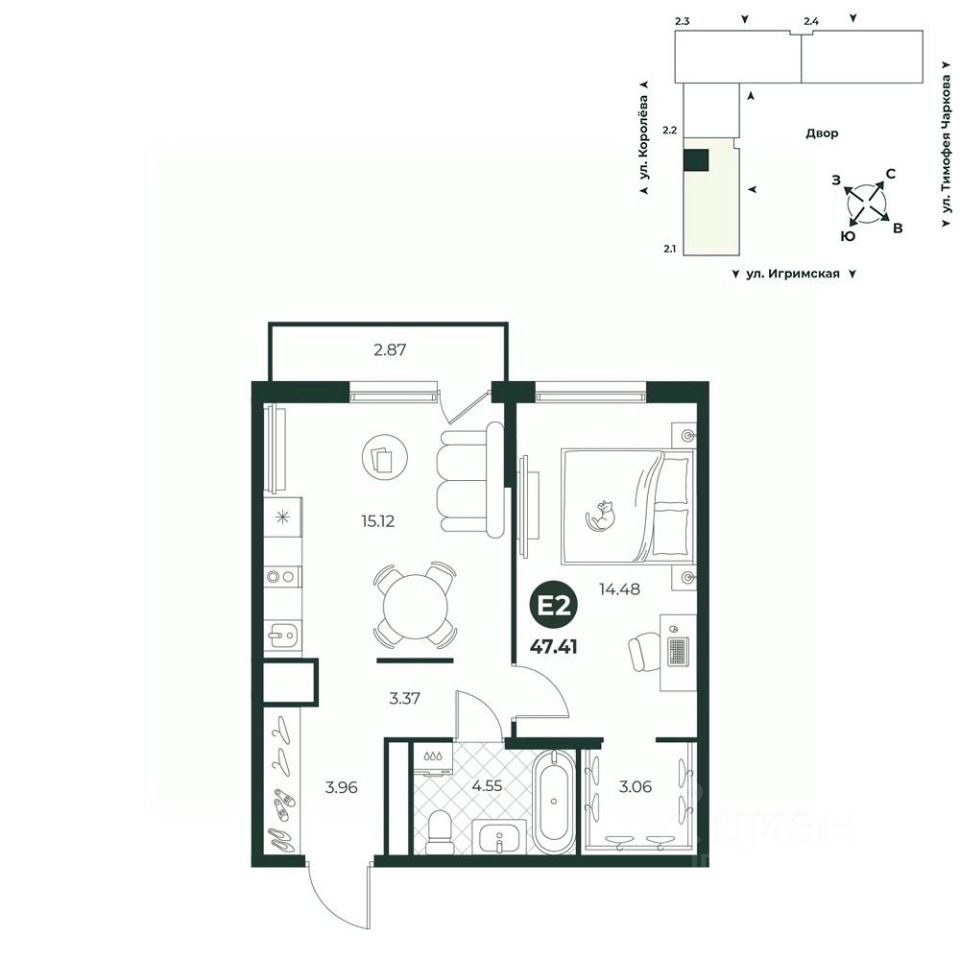 Евродвухкомнатная квартира с мастер-спальней, оборудованной гардеробной. Просторная кухня-гостиная позволяет разместить большой стол, за которым будет приятно собираться всей семьей и играть с друзьями в настольные игры. С французского балкона открывается вид на променад. В прихожей достаточно места для размещения шкафа с одеждой.