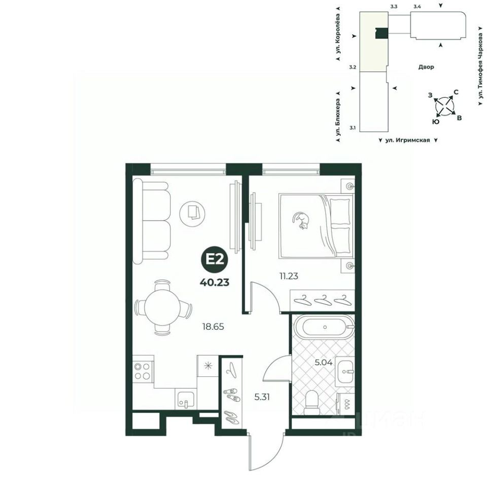 Евродвухкомнатная квартира с просторной кухней-гостиной позволяет устраивать семейные ужины и встречи с друзьями. Санузел совмещенный. В прихожей есть ниша под шкаф.