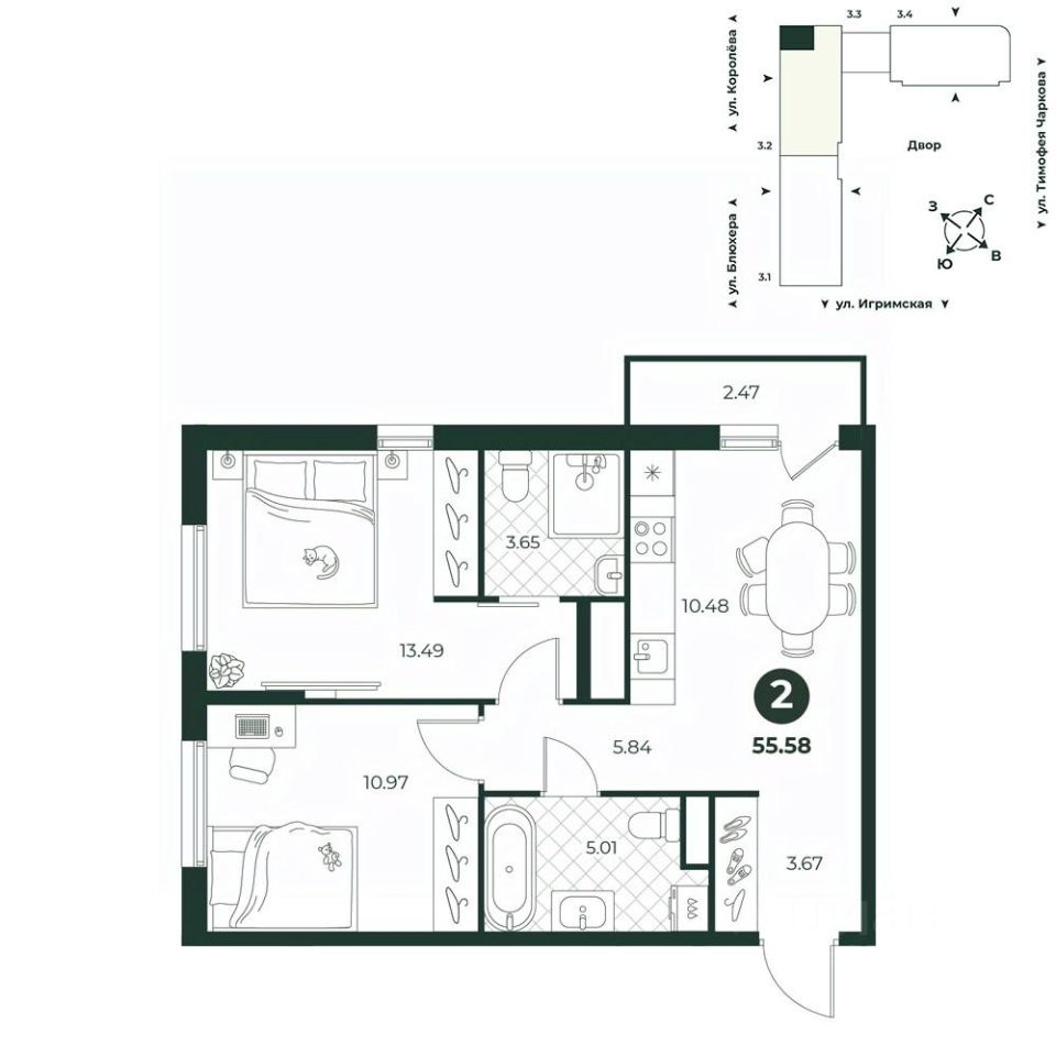 Классическая двухкомнатная квартира с мастер-спальней, оборудованной санузлом. Из просторной кухни-гостиной можно выйти на балкон. В прихожей есть ниша под шкаф. Окна квартиры на две стороны.