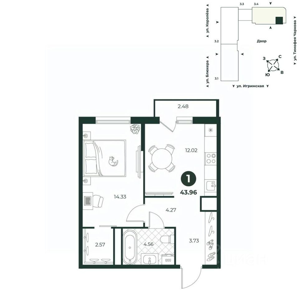Классическая однокомнатная квартира с мастер-спальней, оборудованной гардеробной. Из кухни можно выйти на балкон, откуда открывается прекрасный вид на двор. В прихожей есть ниша под шкаф. Санузел совмещенный.