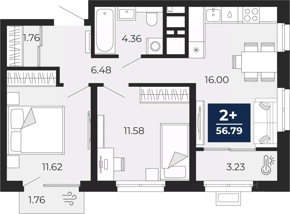 Двухкомнатная квартира от застройщика в ЖК ''Беринг'' на 17 этаже. Общая площадь: 56.79 кв.м. Высота потолков 2.72 м.