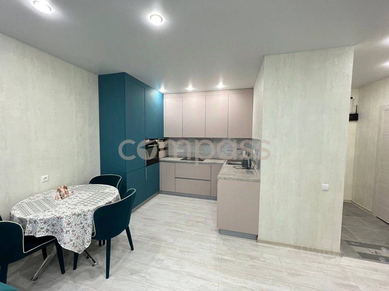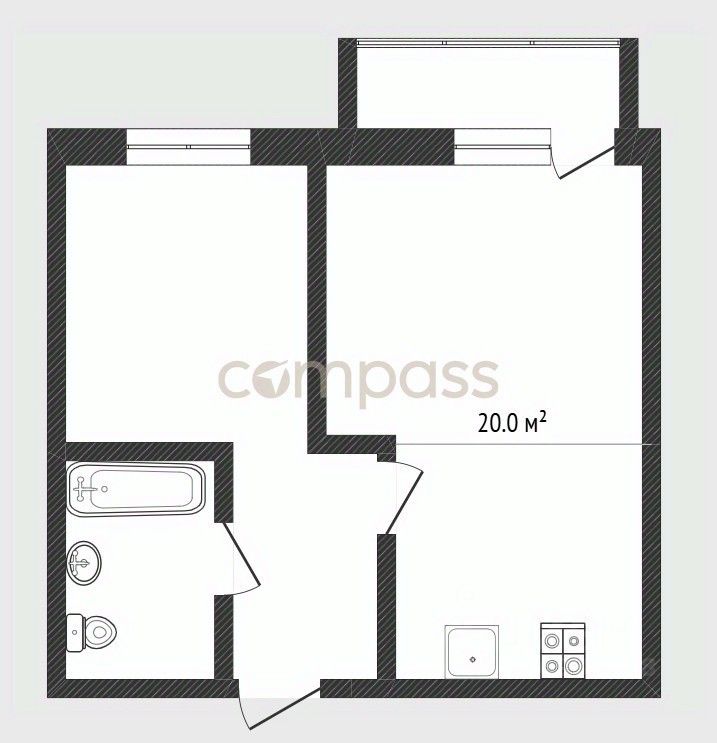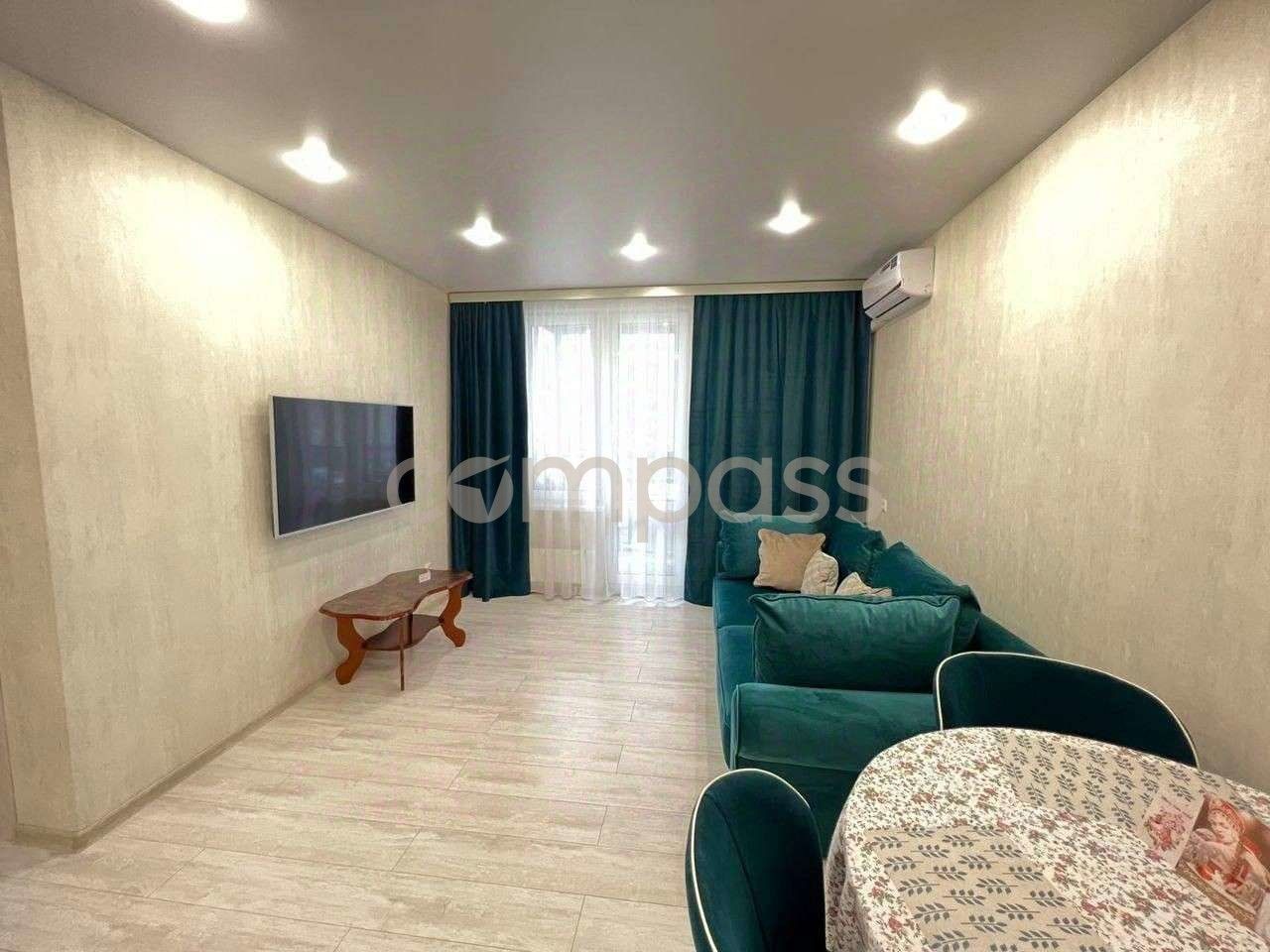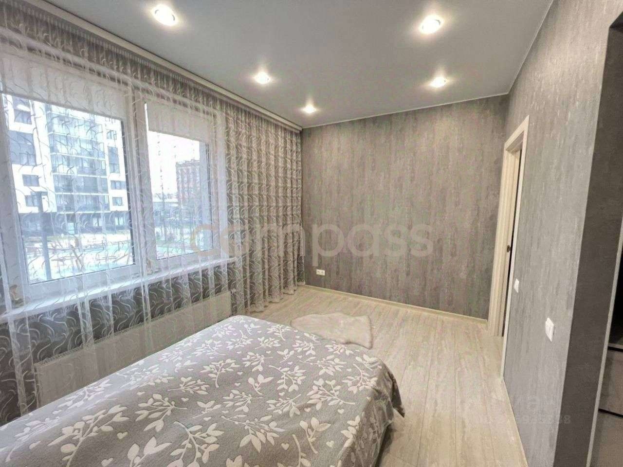 Просторная квартира формата 1+, интересное планировочное решение: кухня гостиная с выходом на балкон с панорамным остеклением и спальня с гардеробной, окна выходят во двор дома.