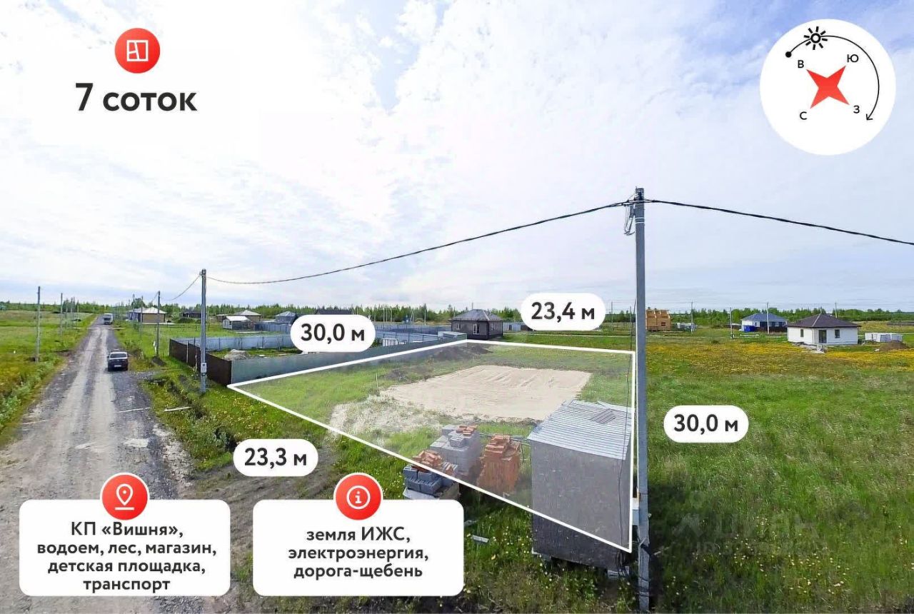 Продаем земельный участок 7 соток ИЖС, расположенный в коттеджном поселке''Вишня'', вблизи деревни Чикча, по СтароТобольскому тракту. Подъездные пути отсыпаны песчано-гравийной смесью, вдоль улицы проходят линии электропередач. В перспективе планируется газификация всего поселка. Рядом полным ходом идет строительство домов для постоянного проживания. С каждым днем популярность коттеджного поселка набирает обороты, соответственно рост цены и спроса гарантирован!!! Вблизи поселка находятся деревни Есаулово и Якуши, в которых уже сейчас активно развита вся инфраструктура, необходимая для постоянного проживания (школа, детский сад, фельдшерско-акушерский пункт, аптеки и магазины). Звоните! Проведем показ в любое удобное для Вас время! МЫ ГАРАНТИРУЕМ ФИНАНСОВУЮ БЕЗОПАСНОСТЬ ДЛЯ НАШИХ КЛИЕНТОВ. Код пользователя: 131994 Номер в базе: 7825973