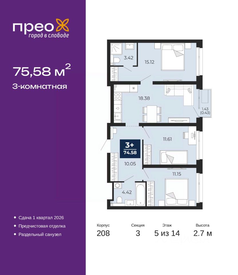 Просторная 3-комн. квартира с предчистовой отделкой в ЖК ''Прео'' на 5 этаже. Общая площадь: 75.58 кв.м. Высота потолков 2.7 м.