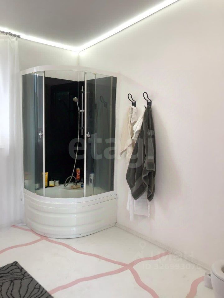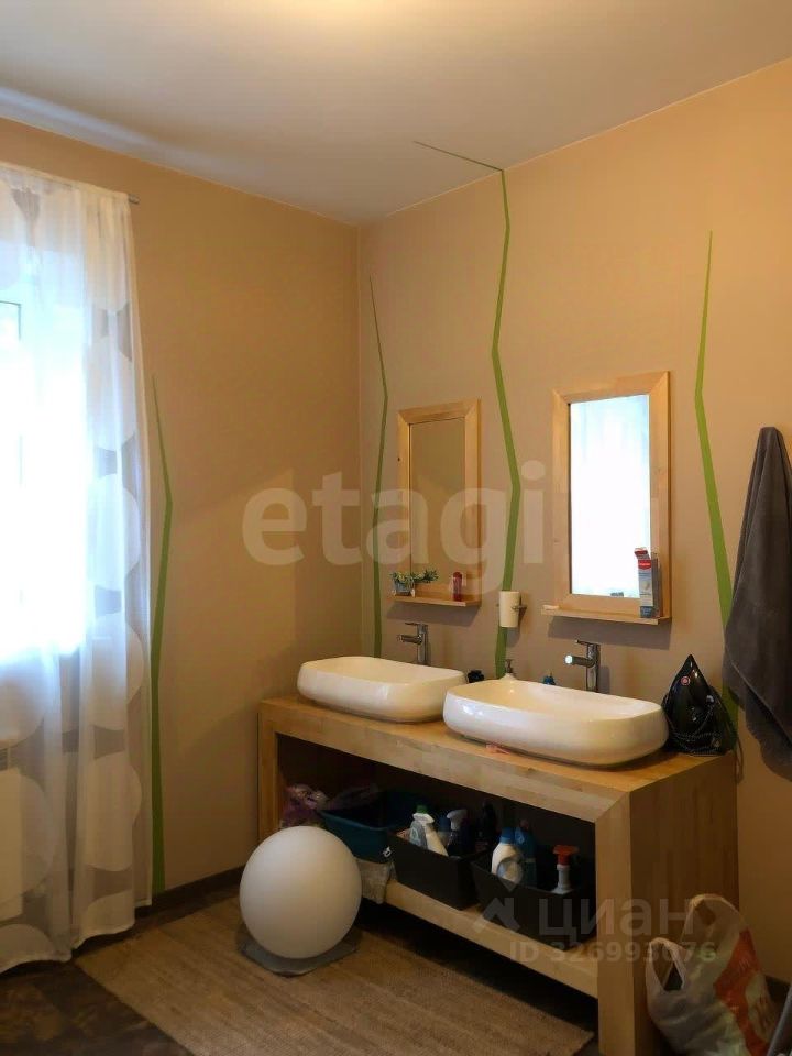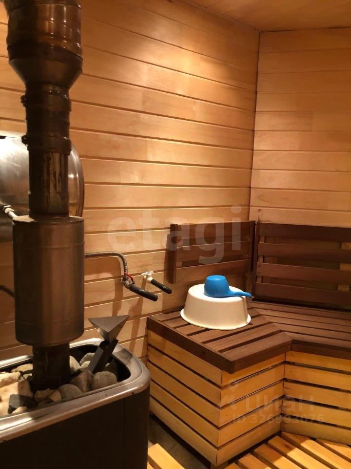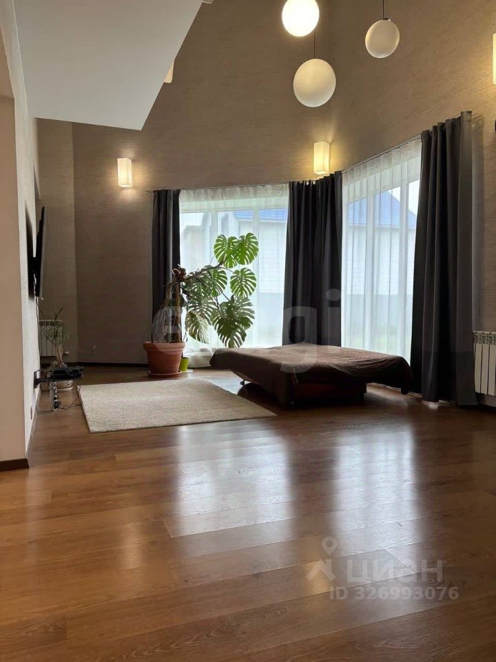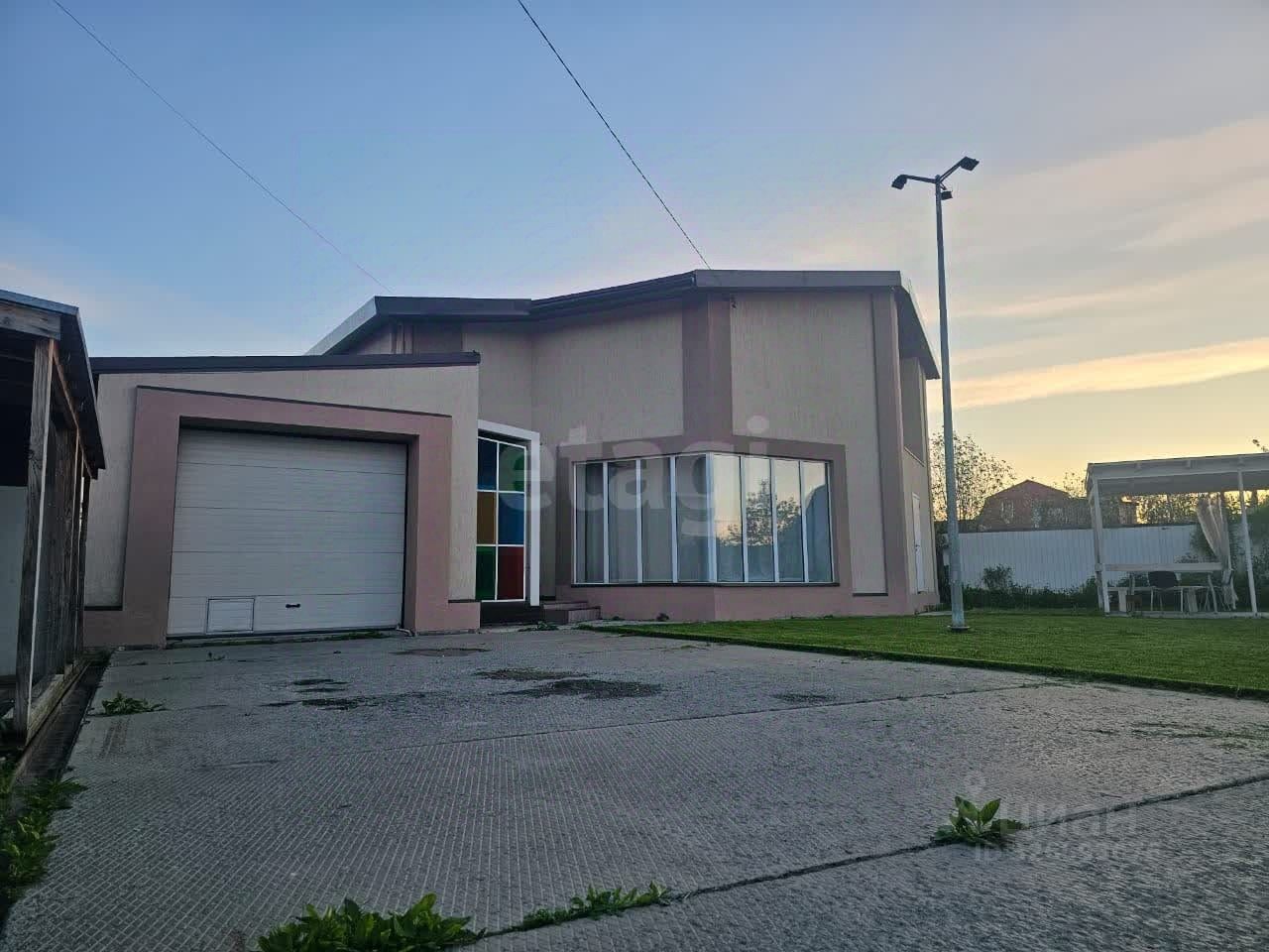 Дом двухэтажный, построен на утеплённой плите S~300м², объединяет жилую часть, гараж и баню. Гараж рассчитан на две крупные машины и оборудован автомойкой. Баня с дровяной печью отделана натуральными материалами — осиной, липой и тёмным абашем, вход в неё организован через смежное помещение из дома. Жилая площадь составляет 195 м² и включает пять комнат: две детские, спальню, гостевую и мастерскую. Дополнительные удобства — два санузла, просторный холл с высокими потолками, кухня-столовая и гардеробная.