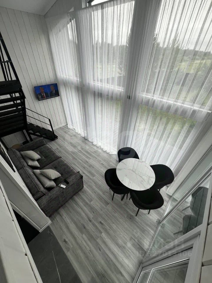 На первом этаже расположена функциональная кухня-гостиная с панорамными окнами, выходящими на сосны, прихожая и совмещенный санузел с душевой кабиной. На мансардном этаже находится уютная спальня. Выполнен качественный ремонт: натяжные потолки, ламинат, керамогранит в зонах с повышенной влажностью. Вся мебель, бытовая техника, включая водонагреватель, и система теплого пола остаются новому владельцу.