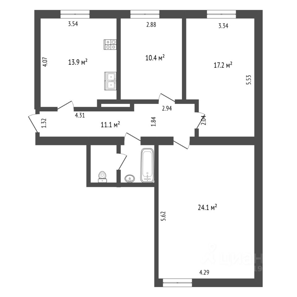 О квартире: Просторная квартира с отличной планировкой. В ней три большие комнаты: 24м², 17м², 10м², кухня 13м², раздельный санузел, широкий коридор.