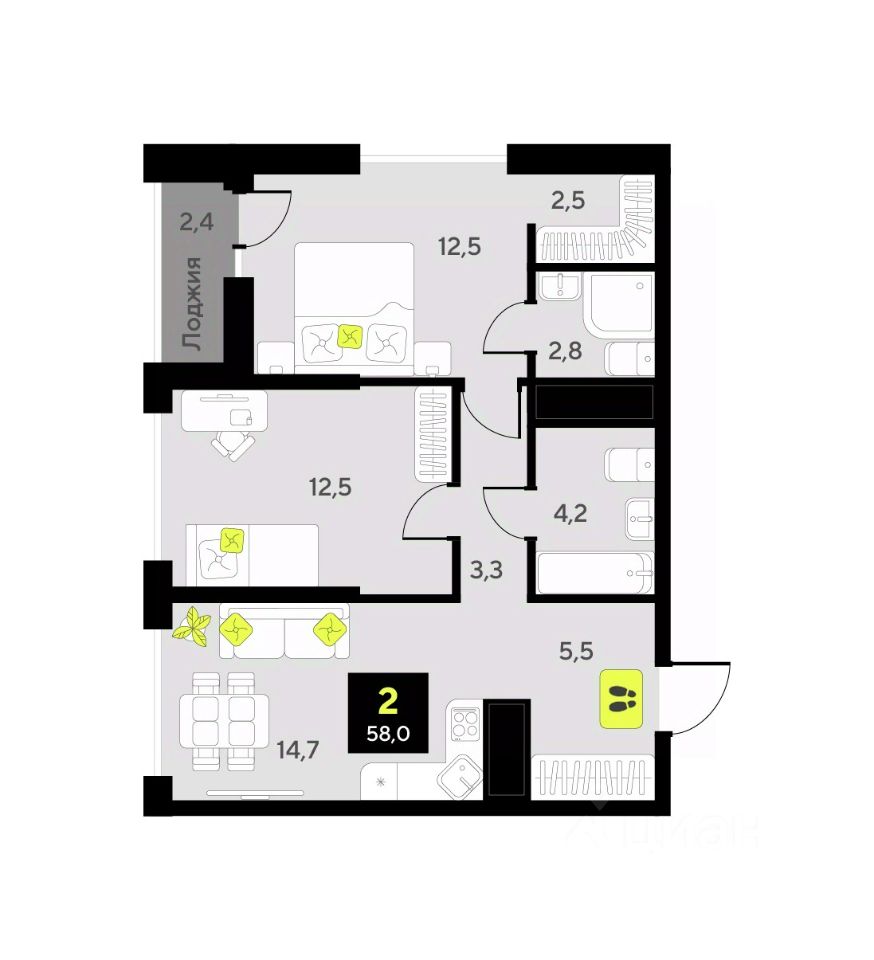 Общая площадь58,4 м2