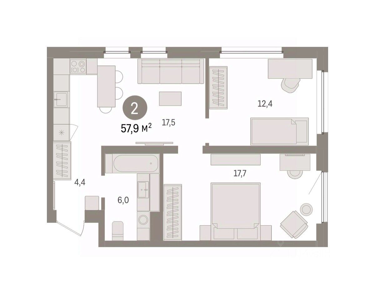 Квартира с кухней-гостиной и двумя спальнями в жилом районе ''Зарека''. Особенности планировки: окна в пол, предчистовая отделка, разнесённые спальни. О доме Замкнутый квартал высотой 8 этажей с 16-ти этажной башней-доминантой и двором на стилобате двухуровневого паркинга.