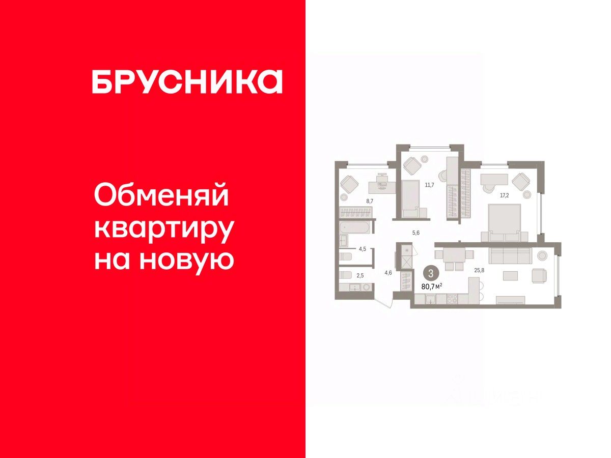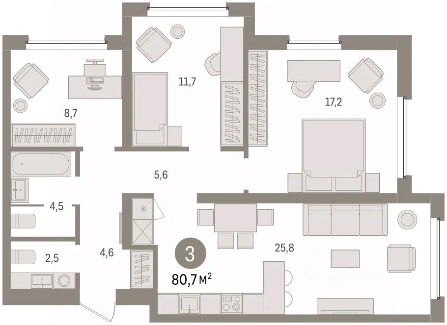 Квартира с кухней-гостиной и тремя спальнями в жилом районе ''Зарека''. Особенности планировки: второй санузел, предчистовая отделка, разнесённые спальни. О доме Замкнутый квартал высотой 8 этажей с 16-ти этажной башней-доминантой и двором на стилобате двухуровневого паркинга.
